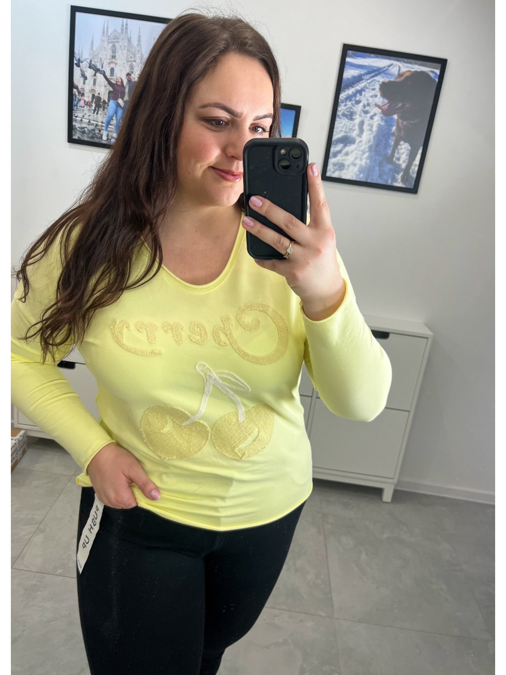Dámske tričko s véčkovým výstrihom a nápisom cherry je štýlový a hravý kúsok na každodenné nosenie. Je vyrobené z 95% bavlny a 5% elastanu, vďaka čomu je príjemné na dotyk.