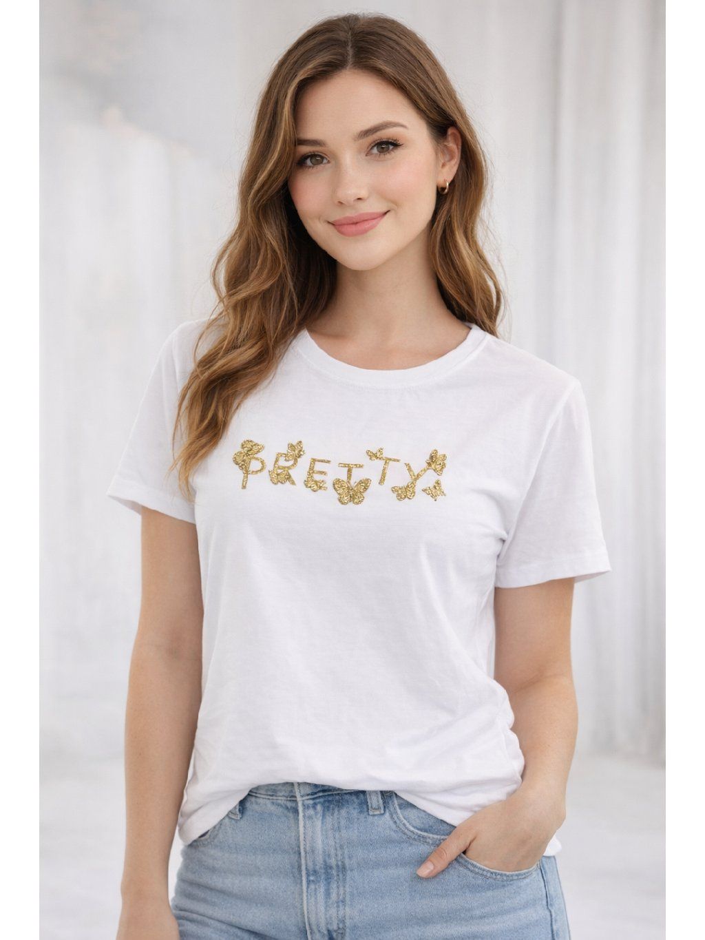 Štýlové tričko s výraznou zlatou potlačou Pretty a motýľmi. Pohodlný strih a príjemný materiál z neho robia ideálny kúsok na každodenné nosenie.