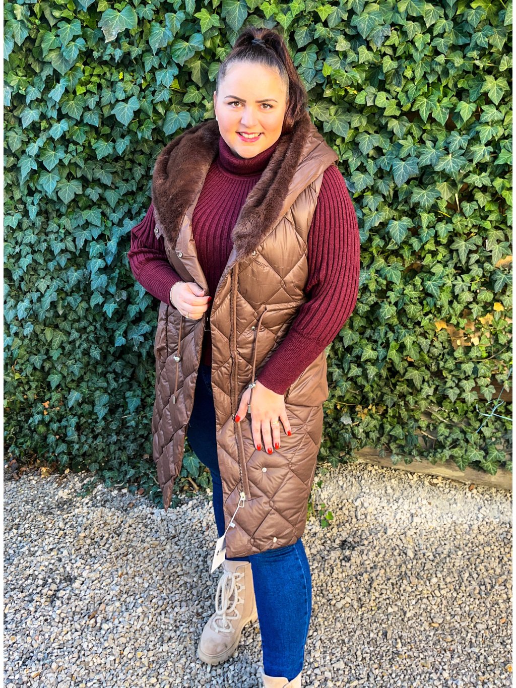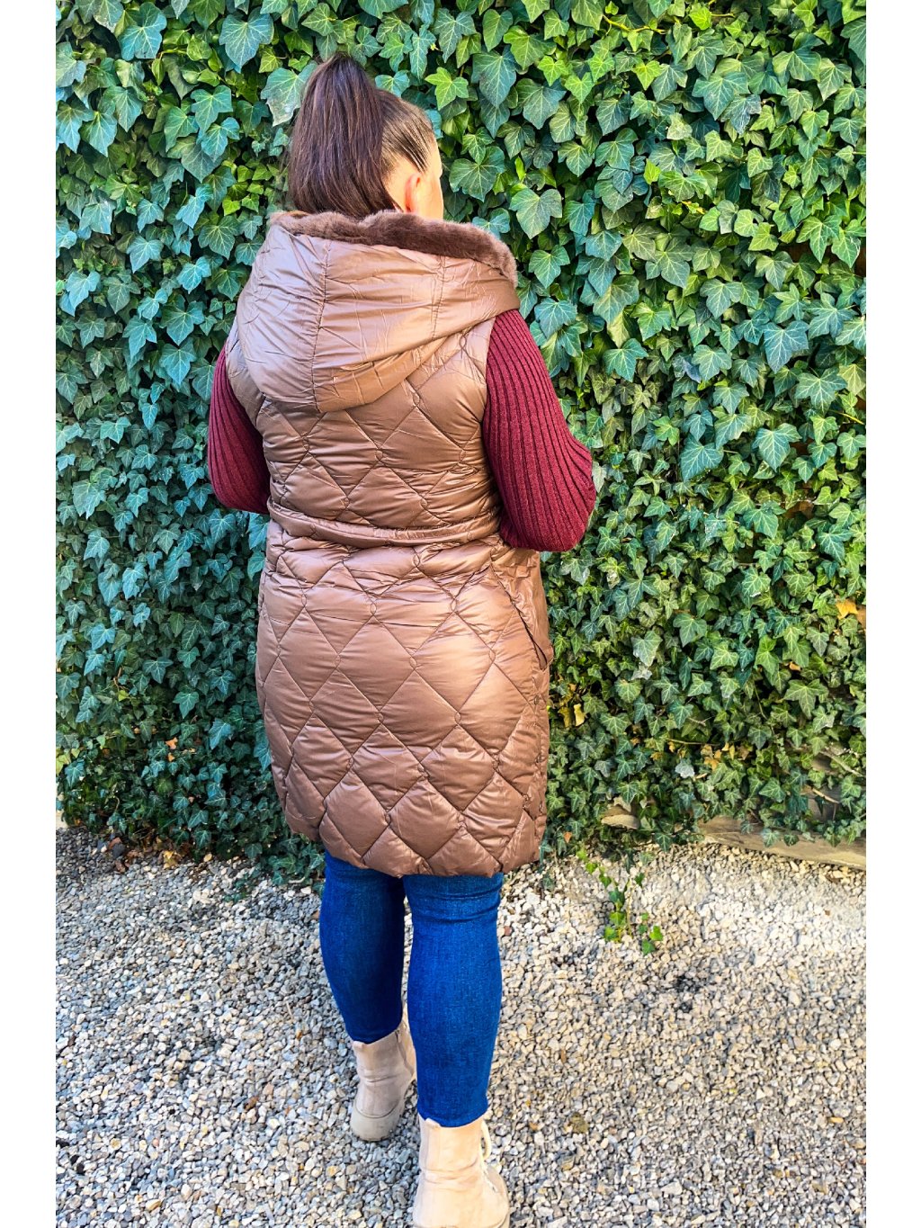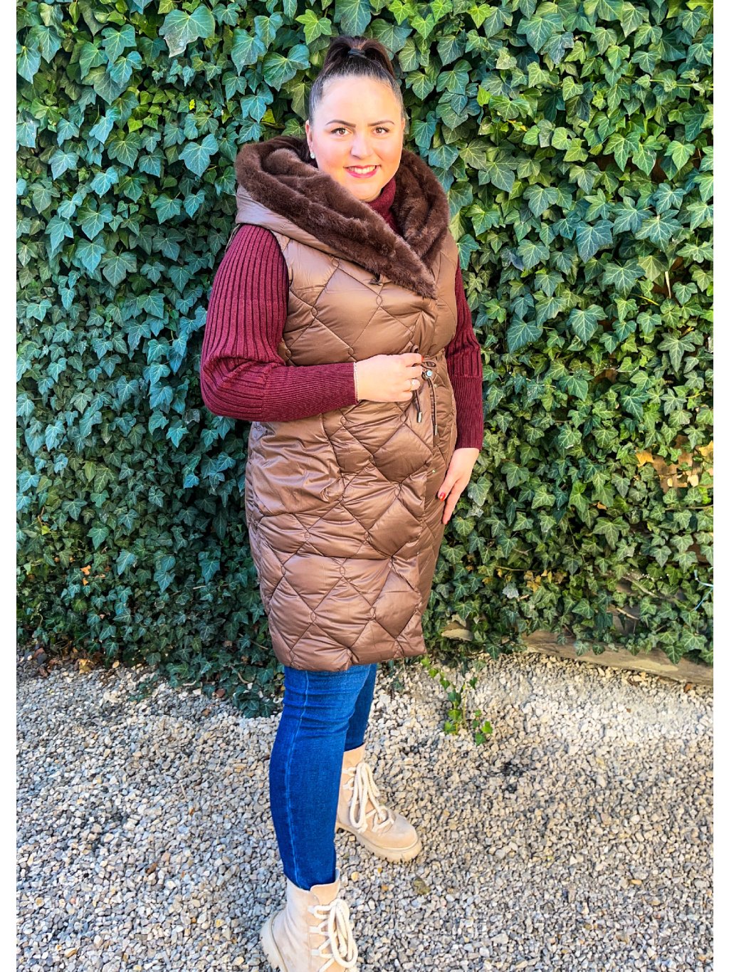 Štýlová a hrejivá vesta ideálna na chladné obdobie. Má mäkkú kožušinku okolo goliera, ktorá dodáva luxusný vzhľad a príjemné teplo. V páse sa dá stiahnuť šnúrkou, takže krásne zvýrazní postavu.