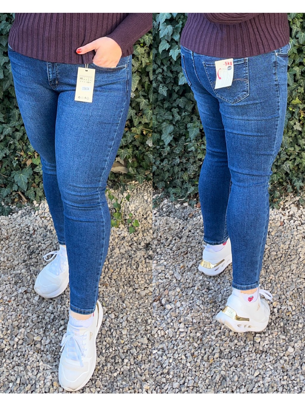 Modelka má v páse 105cm a boky 126cm. Na sebe má oblečenú veľkosť 46.