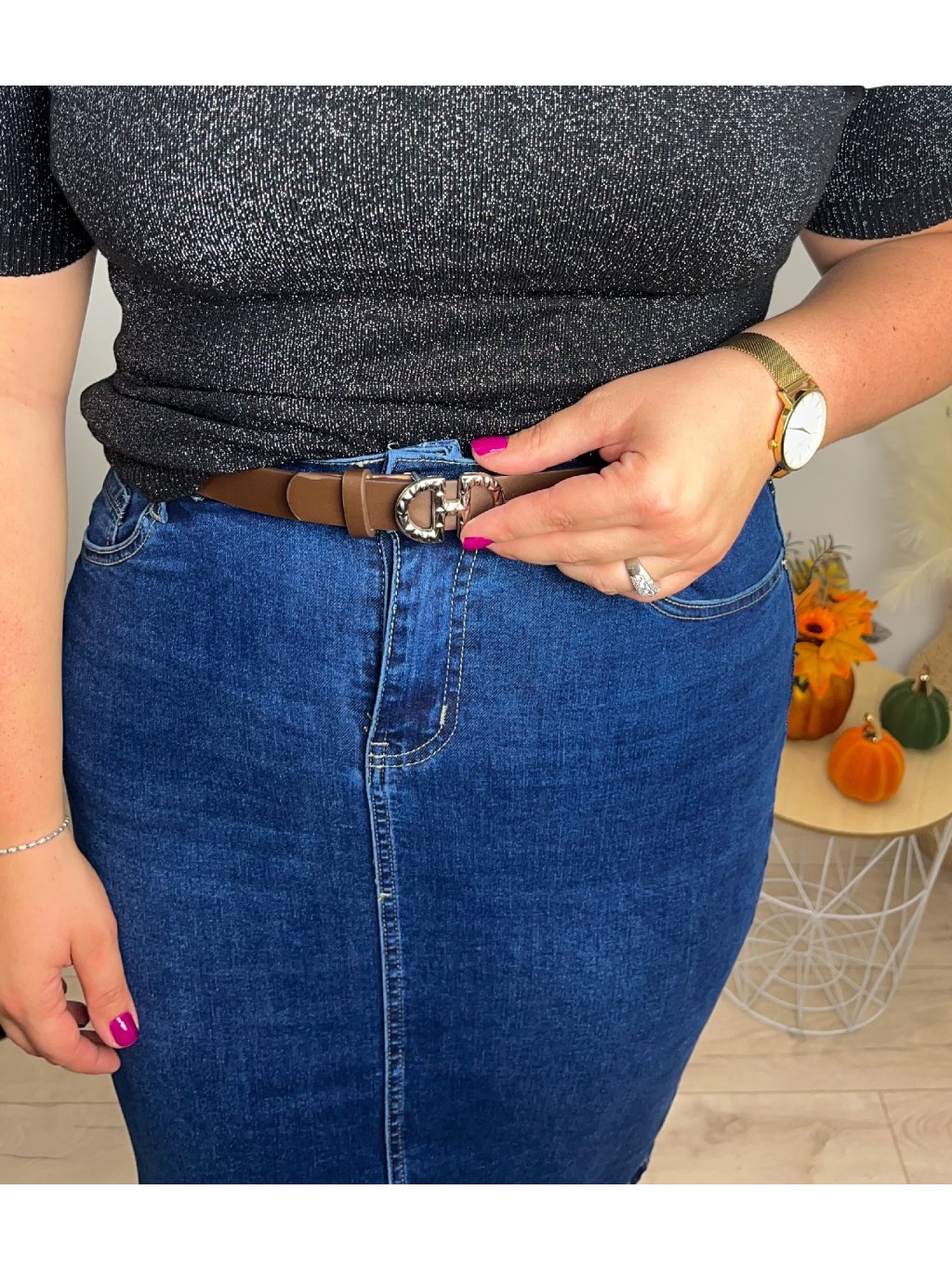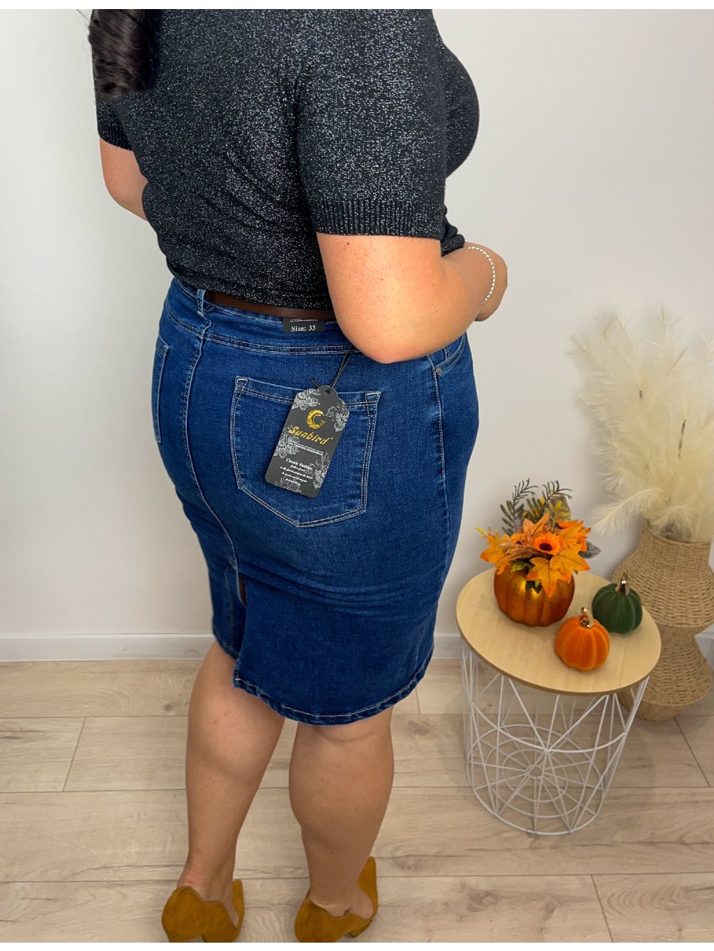Dámska džínsová sukňa z elastickej rifľoviny a s vysokým pásom. Vzadu má rozparok. Súčasťou je aj koženkový opasok.
