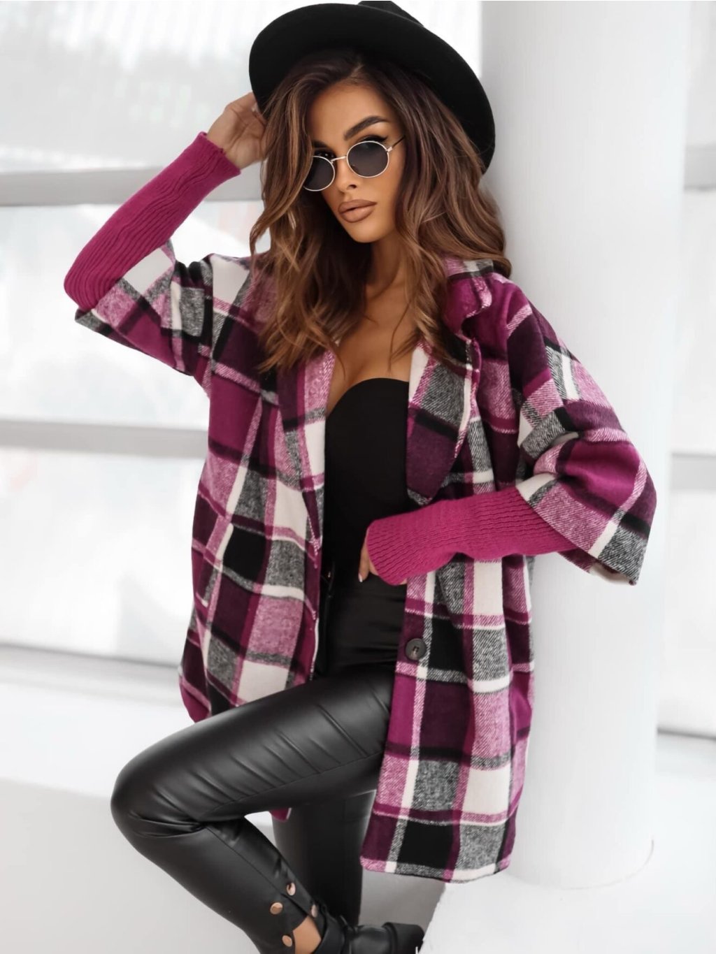 Dámsky kockovaný kabát, ktorý má štrikované rukávy. Je podšíty.