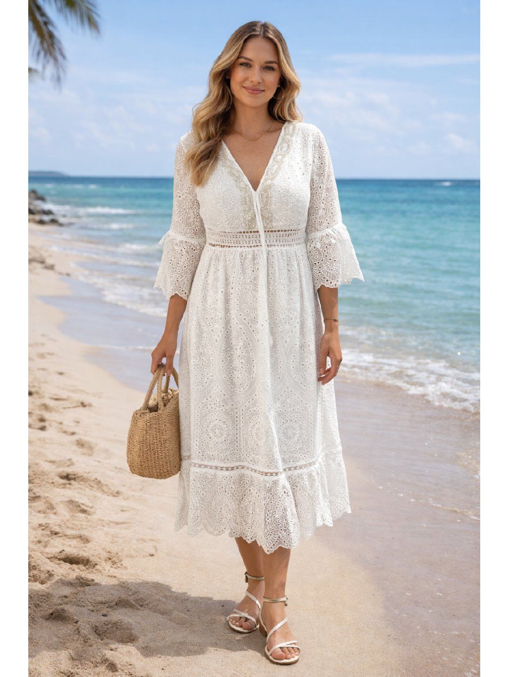 Romantické madeirové šaty, ktoré si zamilujete. Jemná čipka pôsobí elegantne a žensky, pričom ozdobné perly a korálky okolo dekoltu dodávajú šatám luxusný a výnimočný vzhľad. Strih so zvýrazneným pásom krásne formuje postavu a pôsobí veľmi žensky.