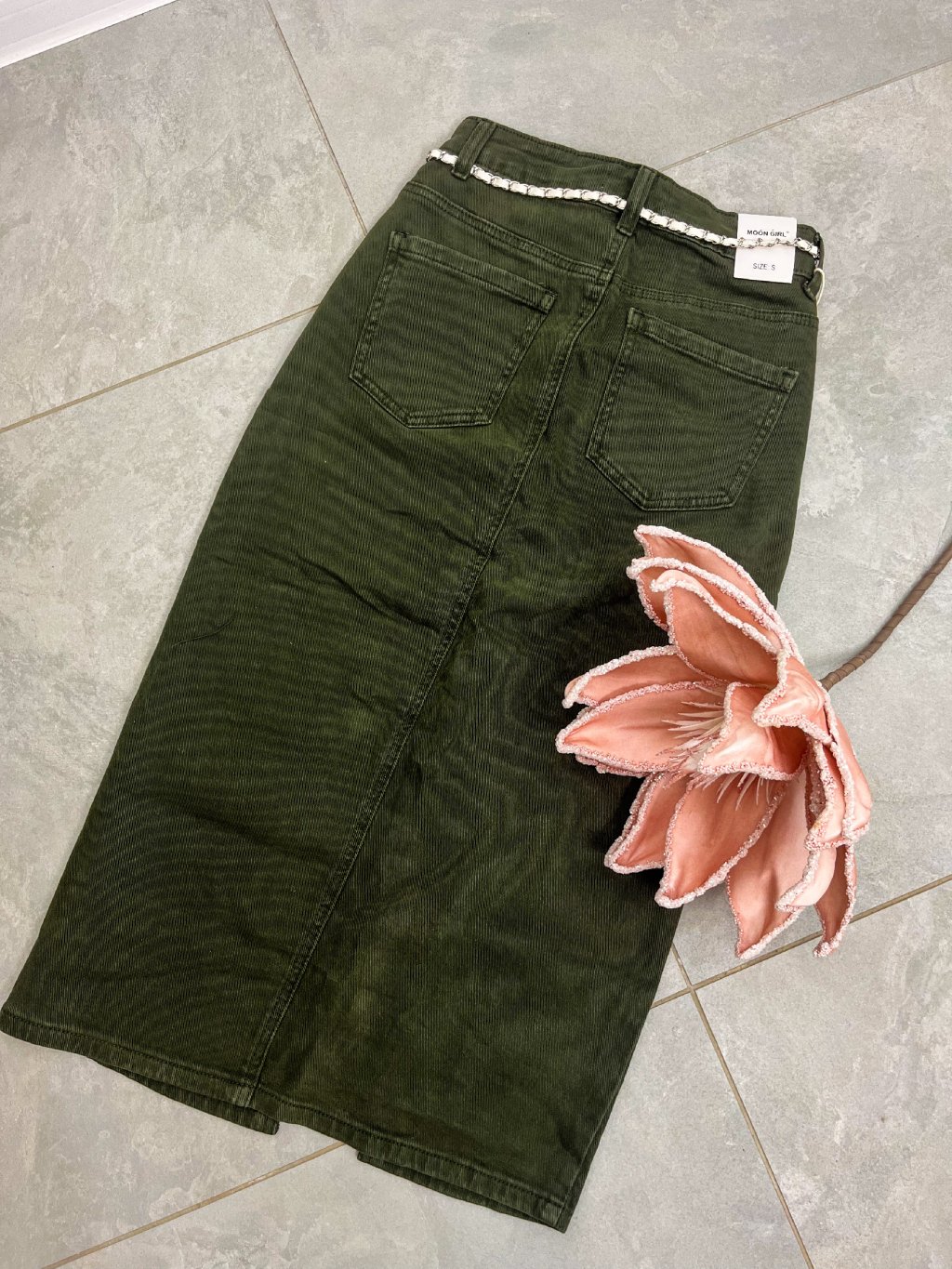 Dámska denim sukňa v olivovej farbe s ozdobným opaskom.