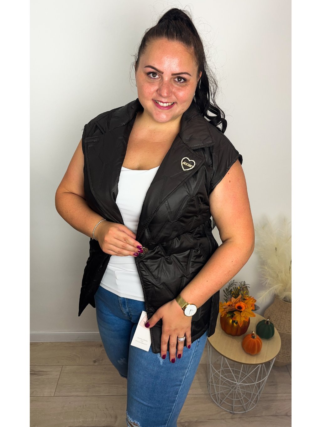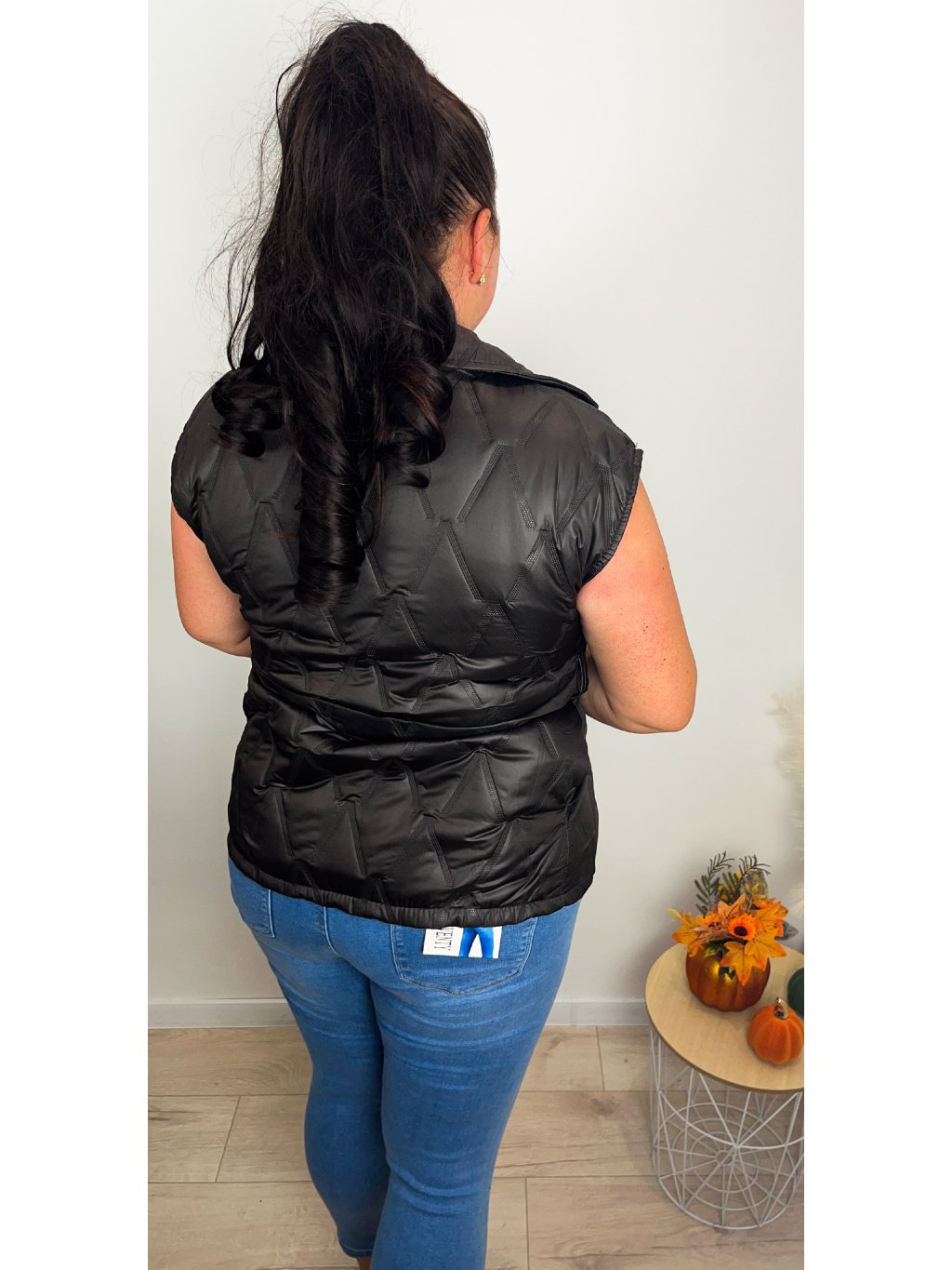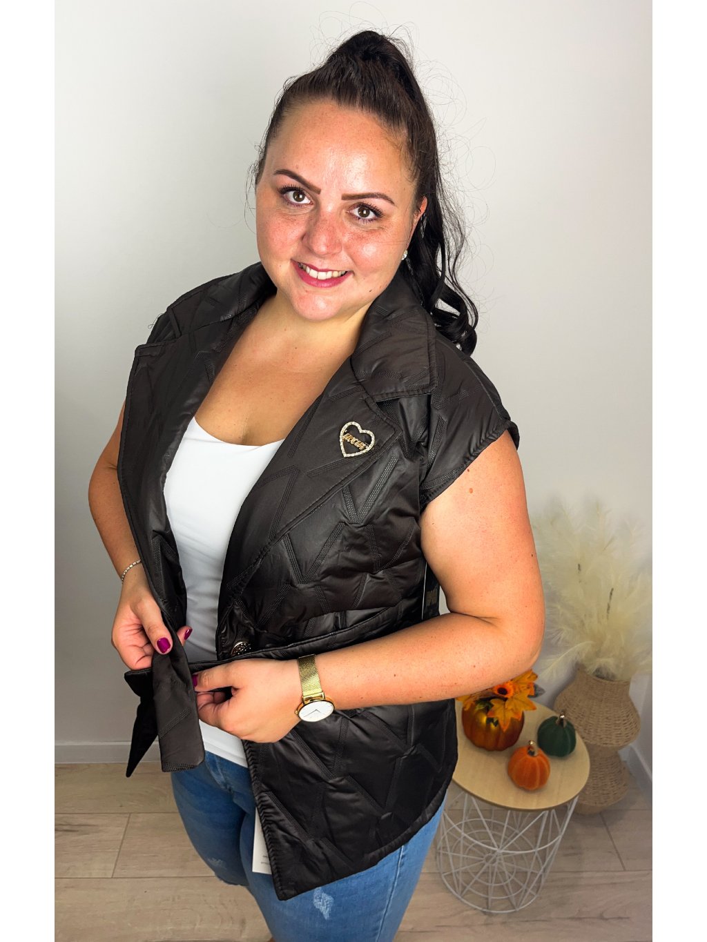 Dámska prechodná prešívaná vesta so zapínaním na gombík a s opaskom.