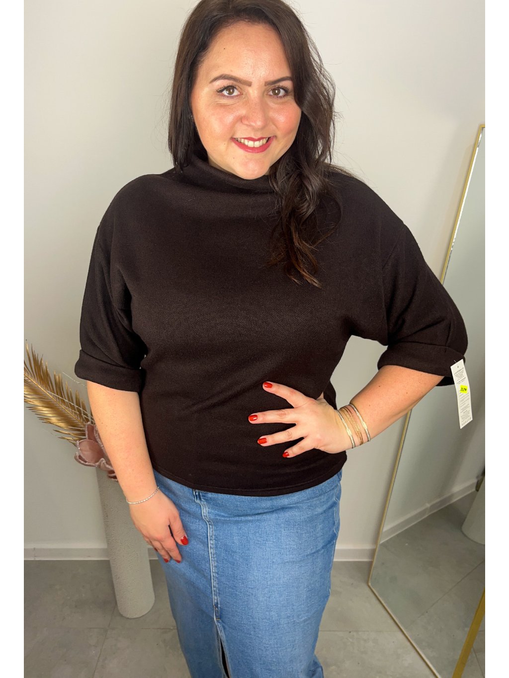 Teplý a mäkký svetrík so stojačikom, ktorý dodá outfitu eleganciu. Kratšie rukávy pôsobia štýlovo a pohodlne.