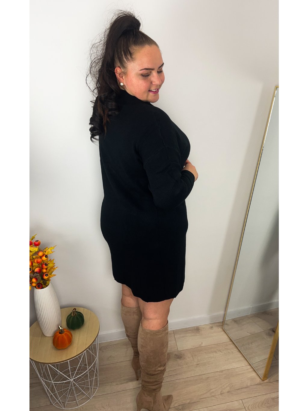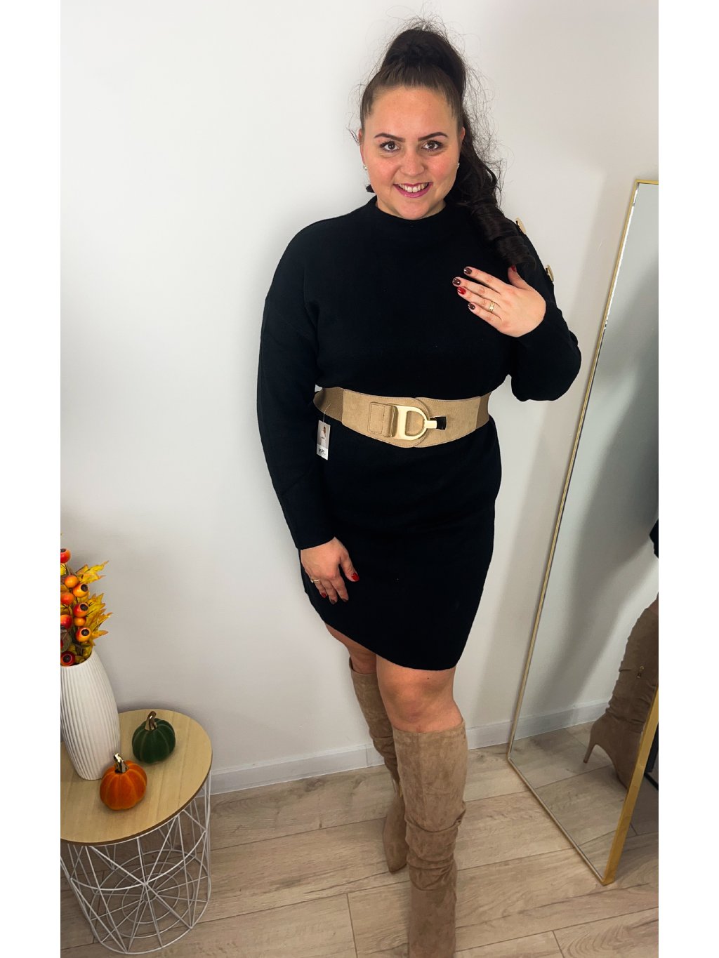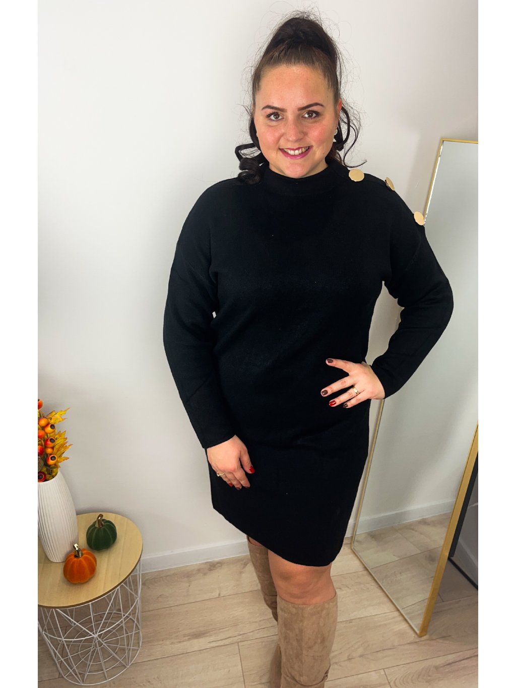 Dámske úpletové šaty zdobené zlatými gombíkmi.