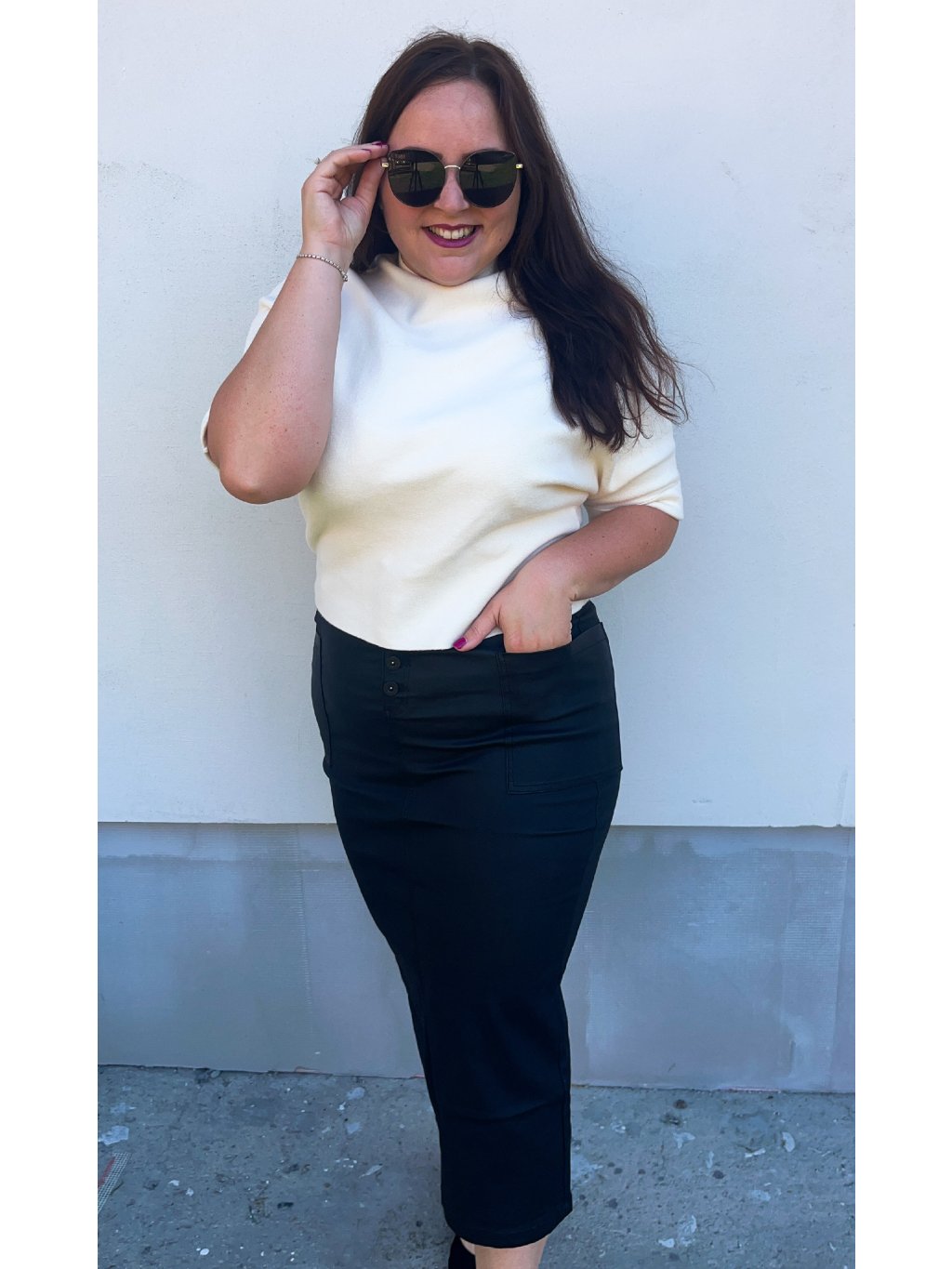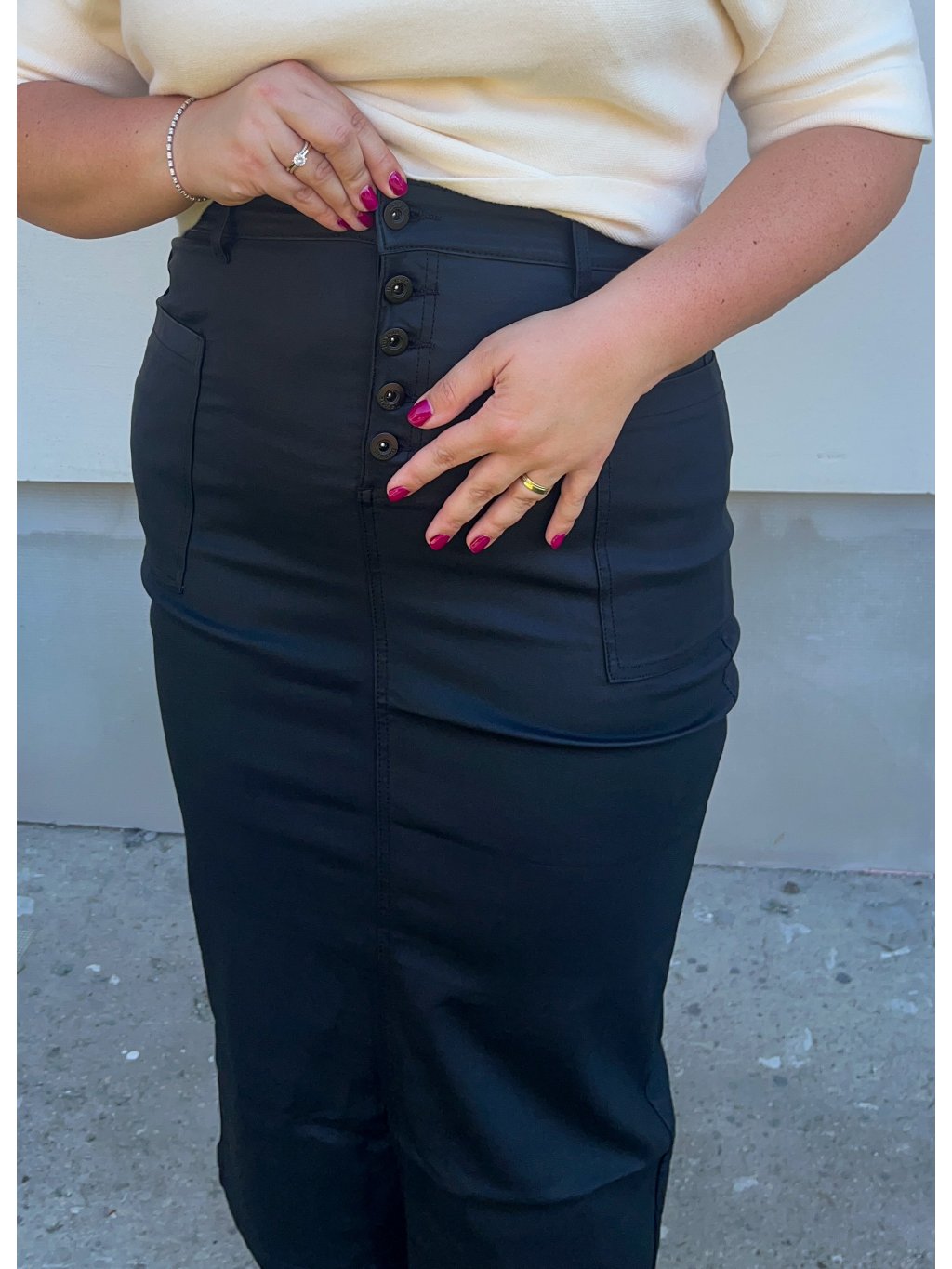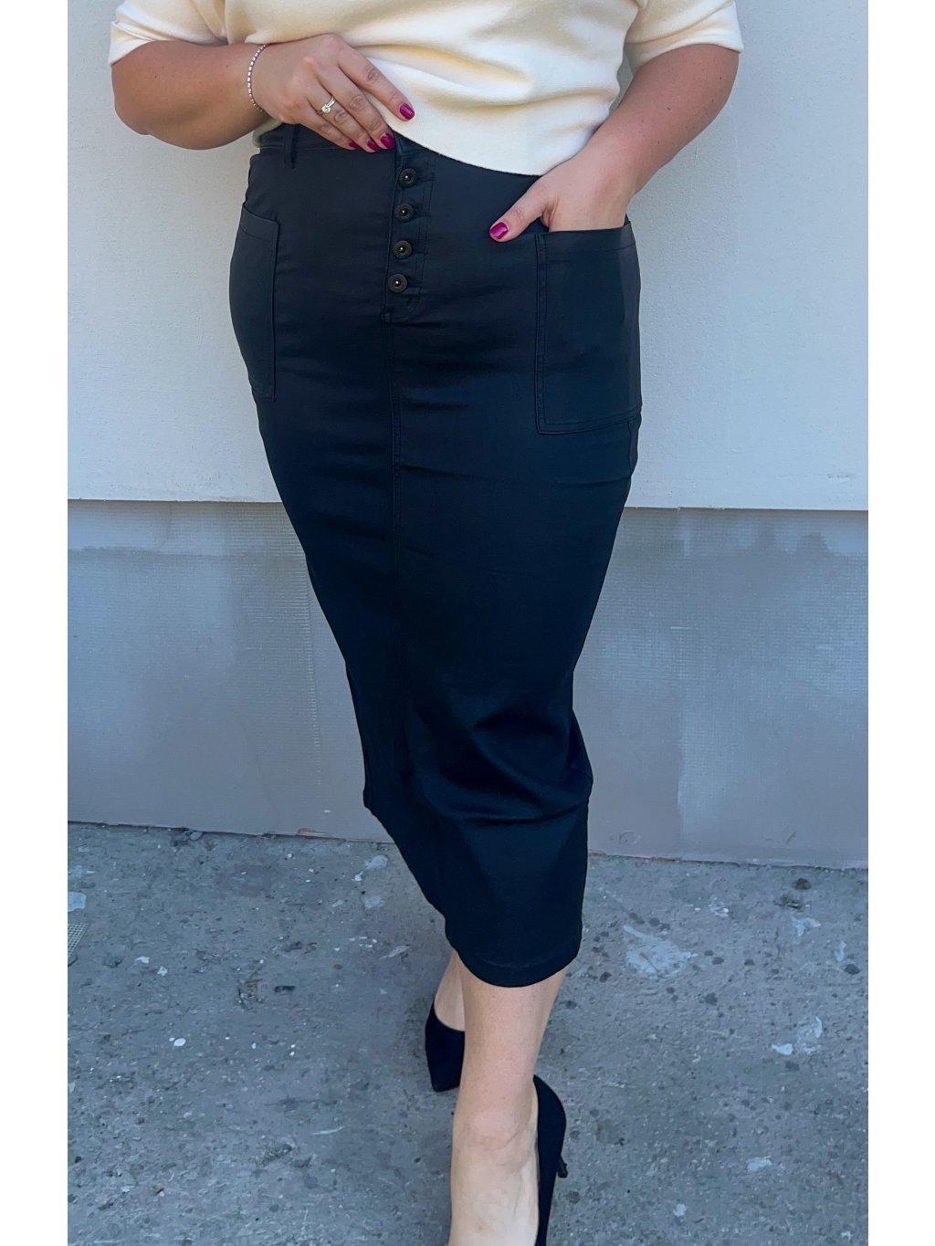 Dámska voskovaná midi sukňa so zapínaním na gombíky, ktorá je nesmierne elastická.