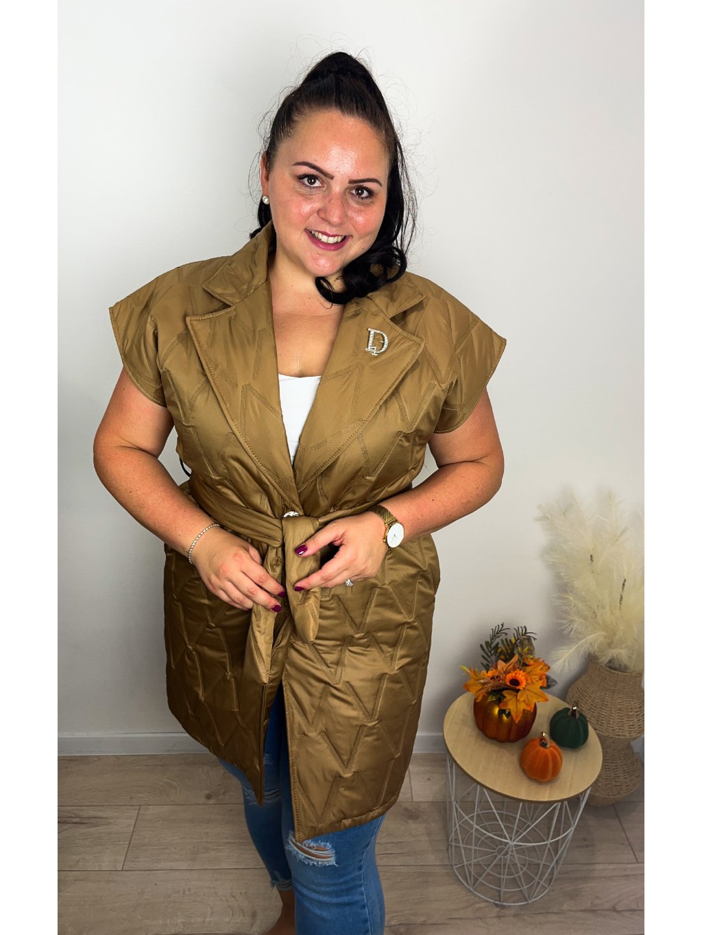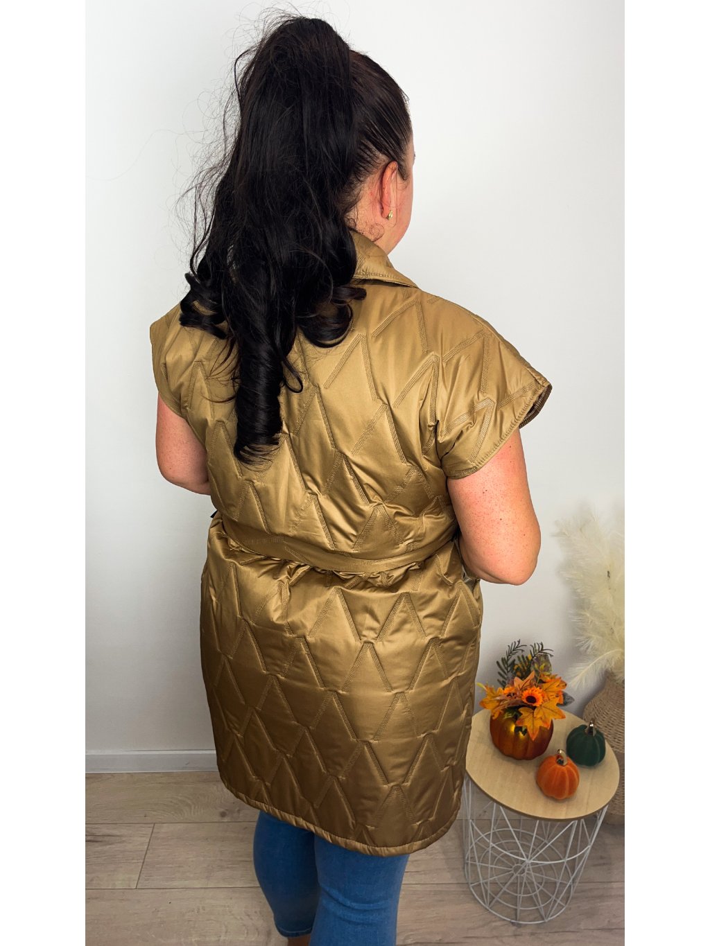 ámska prechodná prešívaná vesta so zapínaním na gombík a s opaskom.
